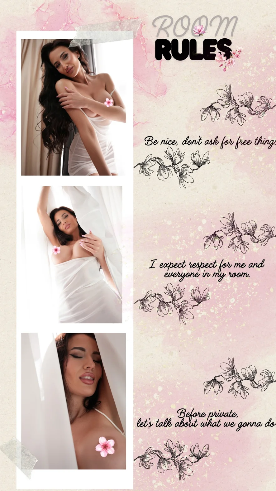 상의탈의, 플래싱, 에로틱 댄스, 음란한 대화, 도기 스타일, 카멜토우, 하이힐, 나일론, 오피스, 69자세, 치마속, 아헤가오, 요가, 가죽, 마사지, 젖치기, 스트립쇼, 스팽킹, 섹스 기구, 블로우잡, 자지 평점, 핑거링, 핸드잡, 페이스씨팅, 오일 쇼, 엉덩이에서 입까지, 젖소, 니플 기구, 패깅, 롤플레이, 오르가즘, 자위, 굴욕, 하드코어, 풋 페티시, 딜도 또는 바이브레이터, 자위행위 지침, 스위치, 재갈, 애널, 분수, 크림파이, 더블 페네트레이션
