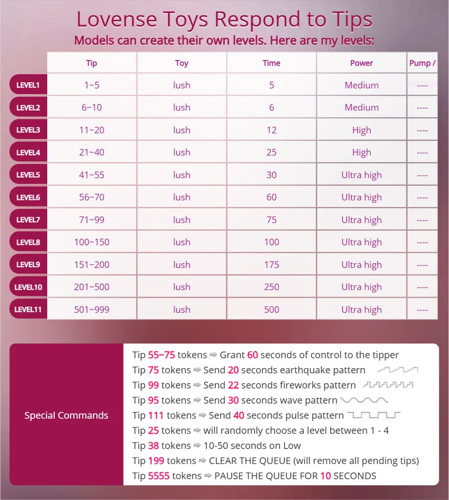음란한 대화, 핑거링, 플래싱, 하이힐, 오일 쇼, 롤플레이, 섹스 기구, 스모킹, 블로우잡, 딜도 또는 바이브레이터, 도기 스타일, 딥스로트, 에로틱 댄스, 자위, 스팽킹, 분수, 애널, 오르가즘, 샤워, 스트립쇼, 트월킹, 상의탈의